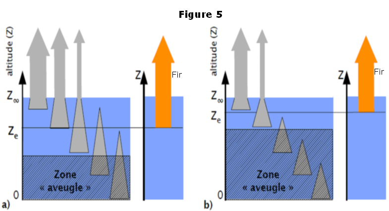 Prenons le cas de référence où l’atmosphère peut être décomposée en 2 grandes couches, comme sur la figure 5 a) : la première aux basses altitudes où le rayonnement infrarouge réémis par les GES n’atteint jamais l’espace, car il est absorbé totalement par les couches situées au-dessus. Cette zone est dite aveugle pour l’espace. Dans la 2nde partie, les rayonnements élémentaires réémis par les différentes sous-couches atteignent l’espace de façon partielle, mais d’autant moins atténués que ces sous-couches sont proches de l’espace. La somme de ces rayonnements, Fir, constitue le rayonnement global infrarouge envoyé par l’atmosphère vers l’espace, c’est celui qui est vu par les radiomètres à bord des satellites. A cette puissance Fir, on peut associer une température Te d’émission de corps noir, et définir ainsi « l’altitude d’émission » Ze comme celle où la température de l’atmosphère est justement Te. Sur terre, cette altitude d’émission est de 3 à 8 km pour les domaines spectraux correspondant aux bandes saturées de H2O et du CO2.