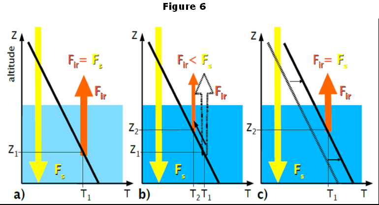 – Dans le cas où la concentration de GES augmente, on a vu que l’altitude d’émission change, prenant une valeur Z₂ supérieure à Z₁, alors que la température d’émission diminue, prenant une valeur T2 inférieure à T1. A cette altitude, la puissance incidente FS = (1-A) S devient alors supérieure à la puissance infrarouge réémise vers l’espace Fir2 = σT₂4, et on a maintenant à l’altitude Z2 un déséquilibre des puissances (figure 6 b). En conséquence, le haut de l’atmosphère se réchauffe, et du fait des mouvements de convection adiabatique, ce réchauffement se propage à toute l’atmosphère, y compris à la surface terrestre, tout en conservant constant le gradient vertical de température, jusqu’à ce qu’un nouvel équilibre des puissances soit atteint (figure 6 c).