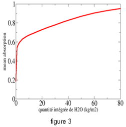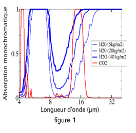 Pour la vapeur H2O en bleu (fig 1), l’absorptivité est totale dans la plage 5-8 µm, et au-delà d’environ 16 µm. Ailleurs, dans la plage 8-16 µm, elle est largement inférieure à 1 mais varie avec la concentration de vapeur d’eau dans l’atmosphère terrestre (cette valeur est actuellement de 25 kg/m2). En faisant varier (fig2) cette moyenne de 5 à 40 kg/m2, qui couvre la gamme des valeurs observées entre les différentes latitudes, on constate en effet un accroissement de l’absorptivité, permettant un accroissement de l’effet de serre dû à ce gaz, dans cette gamme de fréquence des infrarouges.