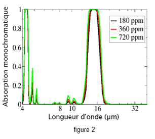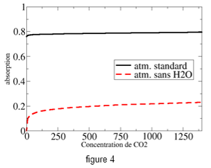 Les figures 1 et 2 représentent la dépendance spectrale de l’absorptivité de H2O et CO2 dans une atmosphère actuelle et sans nuages, dans la gamme spectrale de l’essentiel de l’émission infrarouge de la terre (4 à 40 µm). Les variables y sont également les concentrations en CO2 (en ppm) et en vapeur d’eau H2O en kg/m2 (moyennée sur toute la hauteur de l’atmosphère et par unité de surface terrestre).