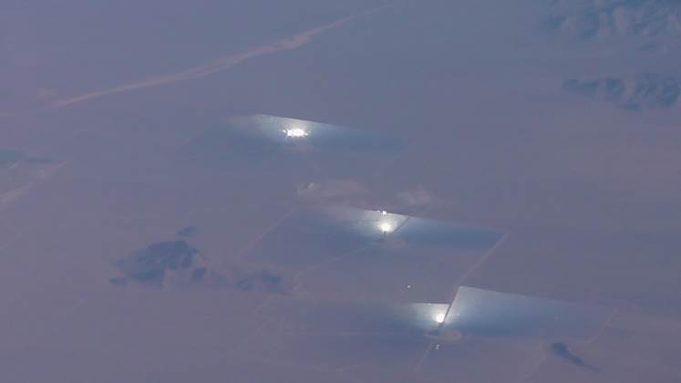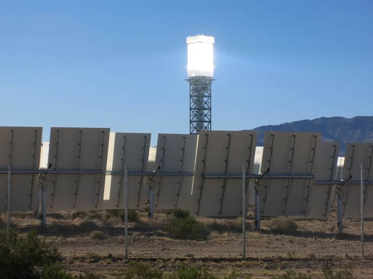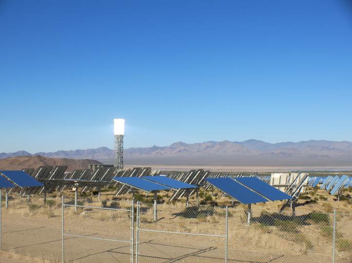 Le voyageur qui se rend de Los Angeles à Las Vegas à travers le désert de Mojave par la route voit des choses étonnantes ; les arbres de Joshua, figures emblématiques des Westerns, puis, passé le col de Mountain Clark pass, 70 km avant Las Vegas, il aperçoit au loin trois points lumineux, blancs comme Venus un soir d’hiver, perchés sur des promontoires comme des tees de golf géants. C’est la centrale expérimentale solaire d’Ivanpah, mise en service -ou plutôt en test- début 2014.