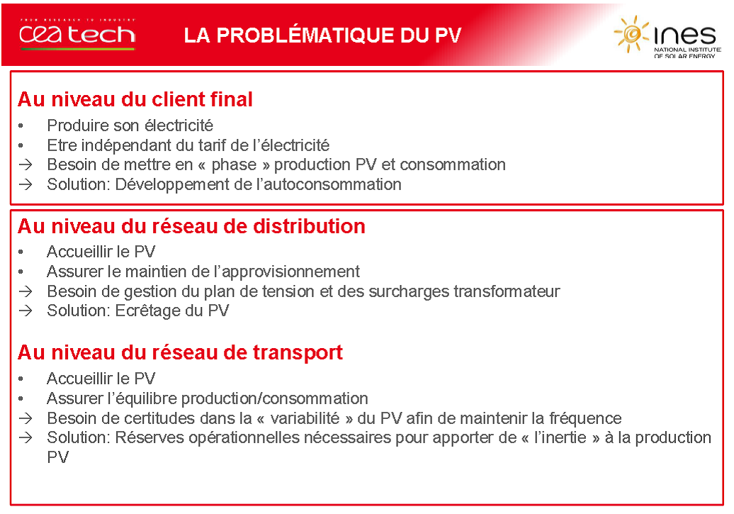 D’un point de vue purement technique, le stockage des ENR est pourtant devenu incontournable dans les réseaux des îles (Corse, DOM-TOM) par définition non interconnectés, les gestionnaires de réseaux étant autorisés à déconnecter toute ferme ENR de puissance supérieure à 100 kW lorsque la puissance photovoltaïque (PV) instantanée injectée sur le réseau dépasse le seuil de 30% de la puissance appelée au même moment. Ainsi, l’exploitant d’une centrale PV non équipée de stockage verra son outil de production (et donc son capital) inutilisé et son retour sur investissement dégradé. Allant plus loin dans l’assimilation des fermes PV à des centrales traditionnelles, les appels d’offre de la Commission de Régulation de l’Energie (CRE) exigent désormais une nouvelle catégorie de centrales photovoltaïques équipées de systèmes de stockage d’énergie permettant d’exiger de la part des exploitants un engagement prévisionnel à 24 h de quantité d’énergie PV injectée dans le réseau selon des rampes de montée/descente et des puissances maximales prédéfinies, tout écart conduisant à la facturation de pénalités contractuelles. Dans ce contexte, les systèmes de stockage deviennent simplement indispensables, les modélisations réalisées par l’INES aboutissant à un dimensionnement optimal de 600 kWh utiles par MW installé.
