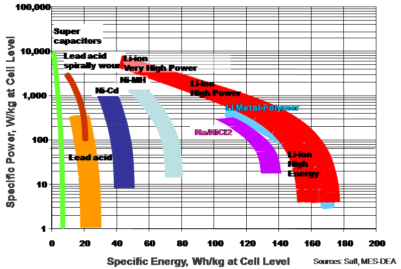 Les technologies de stockage électrochimique sont nombreuses et fortement différenciées, comme en témoigne le diagramme de Ragone Puissance/Energie : au Plomb (la plus ancienne), au Nickel (associé au Cadmium, aux hydrures métalliques, au Zinc), au Lithium, au Sodium (Sodium-Soufre, Sodium-Chlorure de Nickel). En ce qui concerne les technologies Lithium, les plus médiatisées (à juste titre, compte tenu de leurs performances) les premiers travaux de R&D ont commencé dans les années 70. Au début des années 80 apparaissaient les batteries à électrode négative au Lithium métal et à électrolyte polymère. C’est l’origine de la technologie Bolloré/Batscap produite aujourd’hui de façon industrielle, notamment pour les Blue Cars du programme Auto’Lib.