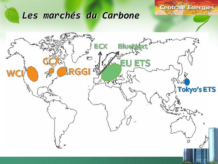 L’ « ECX », European Climate EXchange, situé à Londres, est un marché de « futures », contrats à terme, et concerne 60% des échanges.