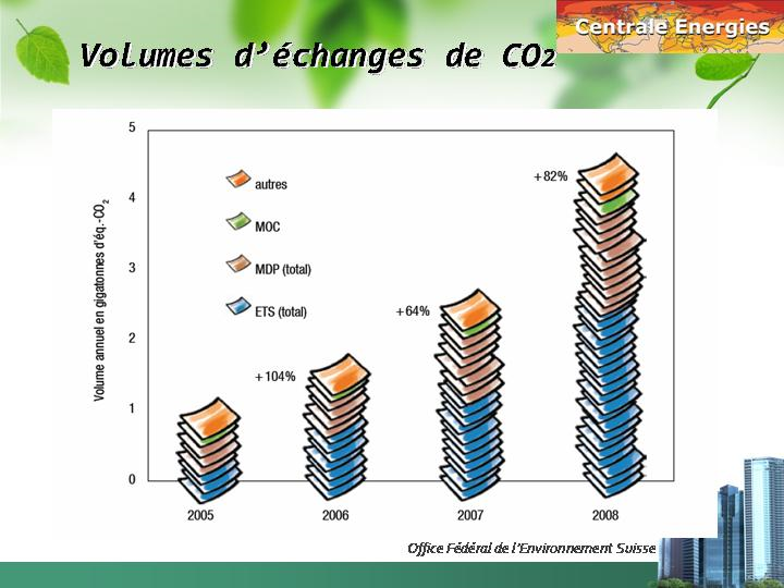 3 Milliards de tonnes de CO2 ont été échangées par les Industriels Européens, pour une valeur de 62,5 milliards d’euros. Le volume impliqué représente 2/3 du volume mondial échangé, le 1/3 restant concernant principalement le MDP, avec par ailleurs 65 millions de tonnes pour le RRGI américain ! Les valeurs d’actifs échangés par les Industriels représentent les 3/4 des actifs mondiaux, le reste étant principalement dédié aux MDP, avec seulement 167 Millions d’euros pour le RGGI américain !